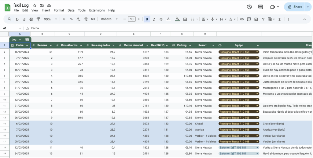 Así que empecé anotando los días que subía a esquiar en el calendario, para llevar la cuenta. De ahí pasé a una hoja de cálculo, donde anotaba lo que me dejaba en parking, también para llevar la cuenta 😂